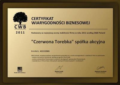 Czerwona Torebka has obtained the Business Credibility Certificate for year 2011. This certificate is an award given to companies, which financial data are a guarantee of high profitability, creditworthiness and financial liquidity and the level of debt and  registered overdue receivables is insignificant. The award has been granted since June 2010 and has a good reputation among both big companies and small and medium sized businesses.  In 2011 over 1000 companies received the BCC. By obtaining the certificate Czerwona Torebka will undoubtedly strengthen its  positive image as a reliable business partner. We are convinced that this award will help in obtaining new contractors and will also influence the company’s  commercial relations.